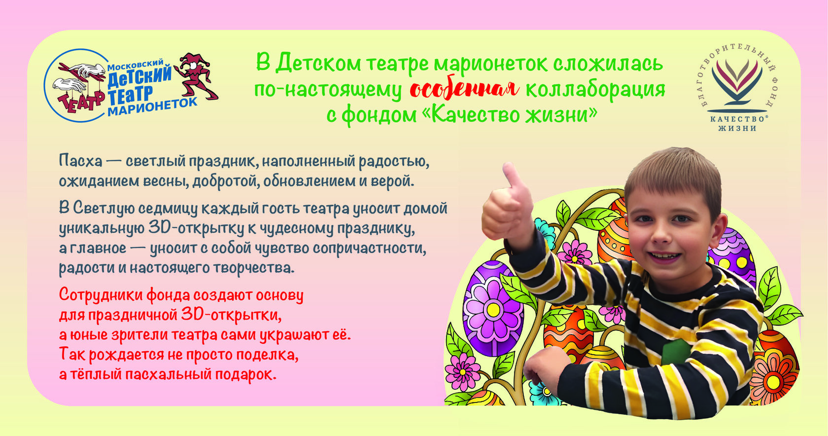 В Детском театре марионеток ( https://marionetki.ru/) произошло что-то очень светлое и настоящее: театр и фонд «Качество жизни» объединились в особенной пасхальной истории.